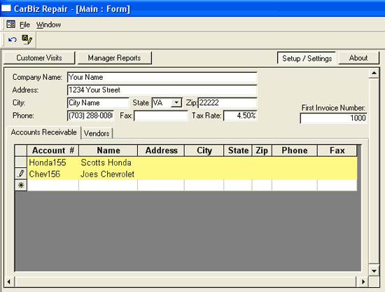 This setup is a one time setup. Remember, every time a parts supplier you deal with is added, you should add them in this screen. Additionally, you may add people/dealerships/organizations who have accounts with you and you provide them credit. The first screen below depicts the "Accounts Receivable" while the lower screenshot shows the location in which you add your Vendors.