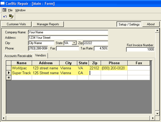 This setup is a one time setup. Remember, every time a parts supplier you deal with is added, you should add them in this screen. Additionally, you may add people/dealerships/organizations who have accounts with you and you provide them credit. The first screen below depicts the "Accounts Receivable" while the lower screenshot shows the location in which you add your Vendors.